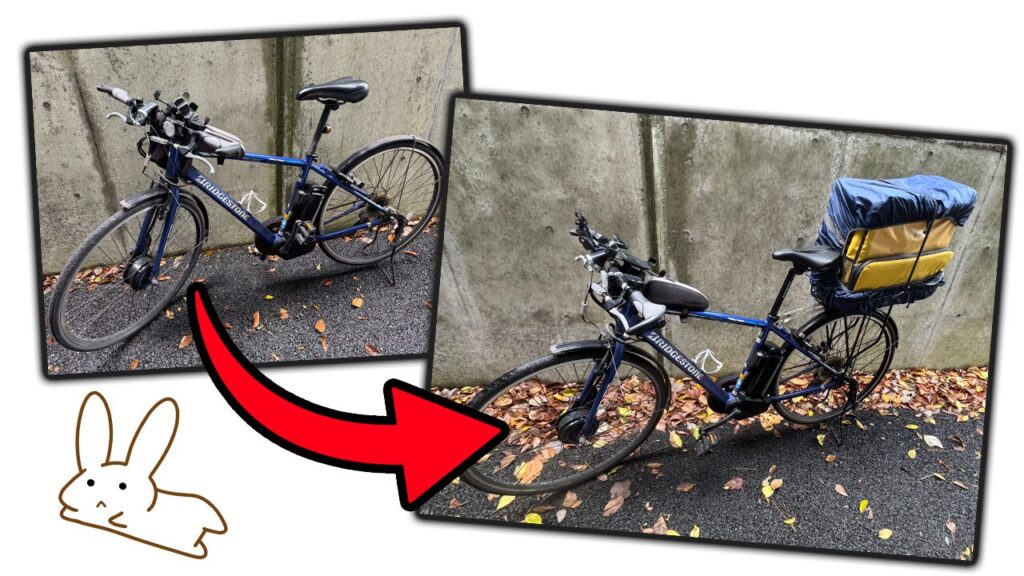 実際に私が配達で使っているTB1e(電動クロスバイク)にウバッグを固定させるパターンを例にして、手順を紹介します!